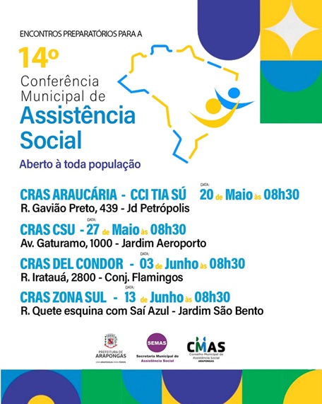 O Conselho Municipal de Assistência Social, através da Prefeitura de Arapongas em parceria com a Secretaria Municipal de Assistência Social (Semas), já está nos preparativos para a 14ª Conferência Municipal de Assistência Social. Afim de preparar a população para esse grande evento, aonde serão discutidos importantes temas e propostas para a Política de Assistência Social no município de Arapongas, serão realizados alguns Encontros Temáticos Preparatórios em diversas regiões da cidade. Confira abaixo os locais, endereços e datas em que acontecerão os Encontros Preparatórios e fique ligado na data, pois a sua participação é de fundamental importância pra esse evento acontecer!