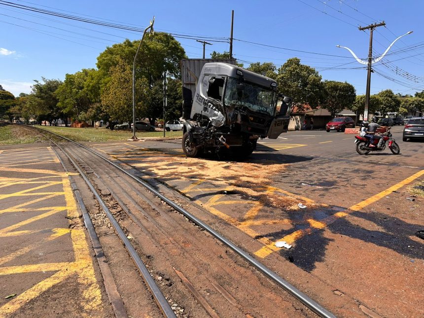 Um trem colidiu com um caminhão baú na tarde desta sexta-feira (12), proximo ao ginásio de esportes na Avenida Paraná, entrada de Cambira.