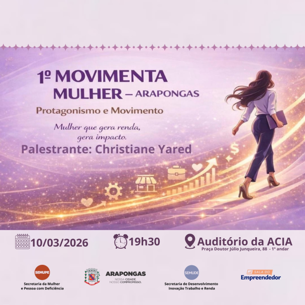 A Prefeitura de Arapongas, por meio da Secretaria Municipal de Políticas Públicas para a Mulher e Pessoa com Deficiência (SEMUPE), promove, nesta terça-feira (10), às 19h30, o 1º Movimenta Mulher – Arapongas, evento cujo tema é “Protagonismo e Movimento”, traz a palestra “Mulher que gera renda, gera impacto”, ministrada por Christiane Yared. Ela é pastora, empresária, palestrante, assessora na Secretaria de Estado da Indústria, Comércio e Serviços do Paraná (SEIC) mulheres empreendedoras.
