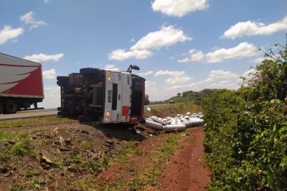 Tombamento de carreta, carregada com botijões de gás, mobiliza bombeiros