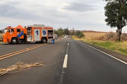 PR-444: Caminhão com carga perigosa tomba entre Mandaguari e Arapongas e rodovia segue interditada na manhã desta quinta