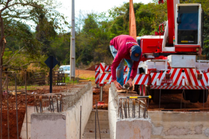 Vigas são posicionadas para concretagem de pontes rurais em Arapongas