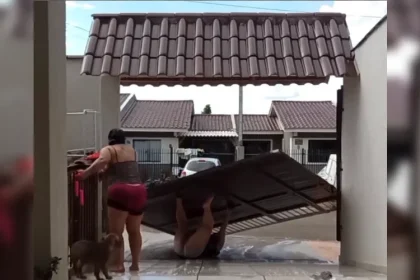 Brincadeira para aliviar calor viraliza após escorregão destruir portão no Paraná