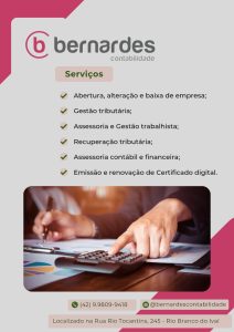 A cidade de Rio Branco do Ivaí celebrou recentemente a chegada de um novo empreendimento que promete reforçar o setor de serviços contábeis da região. A Bernardes Contabilidade, sob responsabilidade da profissional Bruna Gabriela Bernardes — registrada no CRC-PR sob o número 077532/0 —, inaugurou oficialmente sua unidade no município.