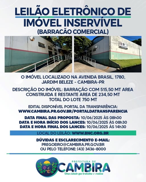 A Prefeitura Municipal de Cambira promoverá, no dia 10 de junho de 2025, um leilão eletrônico para a venda de um imóvel inservível pertencente ao município. O bem em questão…
