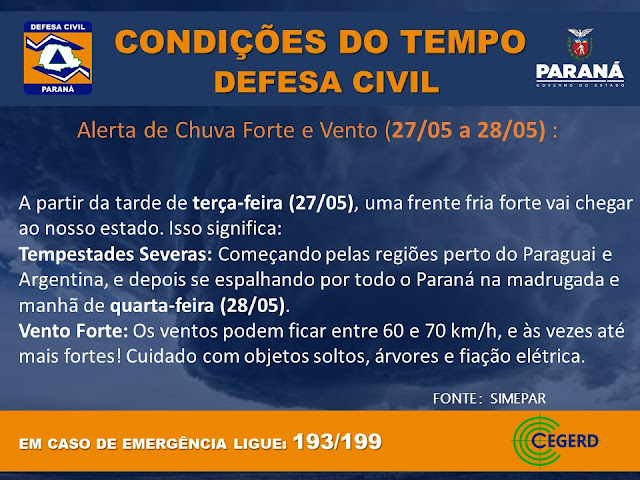 O Simepar e a Defesa Civil do Paraná emitiram alerta de risco para todo o estado devido à chegada de uma frente fria intensa a partir da tarde desta terça-feira…
