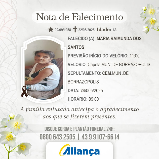 Faleceu em Borrazópolis, neste dia 23 de maio de 2025, a senhora Maria Raimunda dos Santos, com 66 anos Maria Raimunda sempre foi conhecida por sua dedicação e amor à…