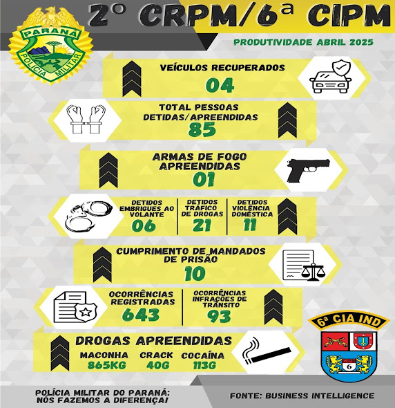 A 6ª Companhia Independente de Polícia Militar (6ª CIPM), com sede em Ivaiporã, divulgou o balanço de produtividade referente ao mês de abril de 2025, registrando 85 pessoas detidas e…