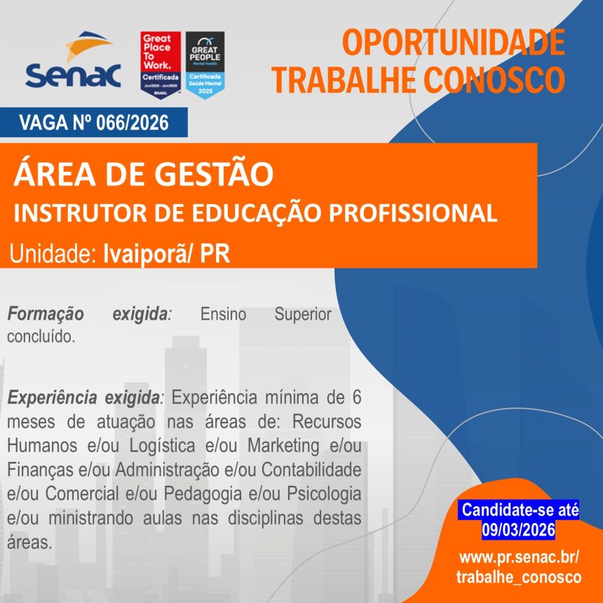 Senac Ivaiporã está com Inscrições abertas para cadastro de currículos destinados a vaga de: Área de Gestão - Instrutor de Educação Profissional. Os interessados devem acessar o site www.pr.senac.br/trabalhe_conosco e candidatar-se até o dia…