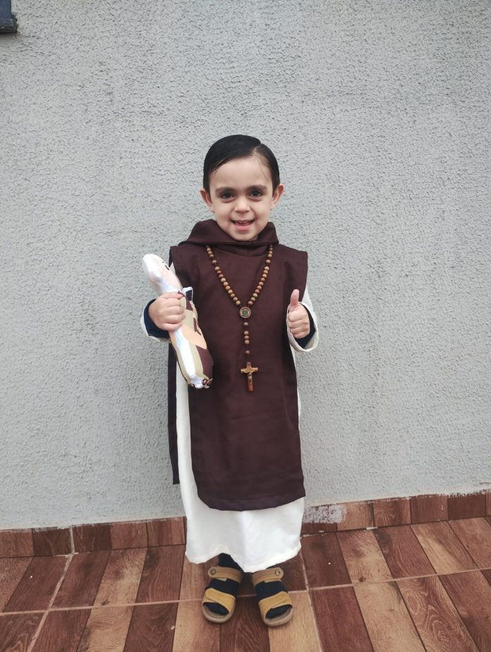 Pequeno Samuel encanta colegas ao se fantasiar de Frei Gilson no “Dia Diferente” do CMEI Mickey