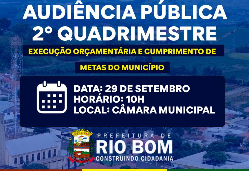 A Prefeitura de Rio Bom realizará no próximo dia 29 de setembro, às 10h, na Câmara Municipal, a Audiência Pública de Prestação de Contas referente ao 2º quadrimestre de 2025.…