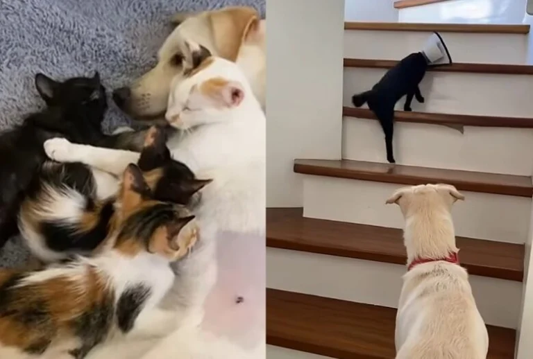 Vídeo: cachorro “adota” filhotes de gata e vira protetor nº 1 dos pets