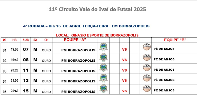 O Ginásio de Esportes de Borrazópolis é local escolhido para a 4ª rodada do 11º Circuito Vale do Ivaí de Futsal, uma competição que vem movimentando o esporte da região. O evento ocorre nesta terça-feira, dia 13, a partir das 19 horas.