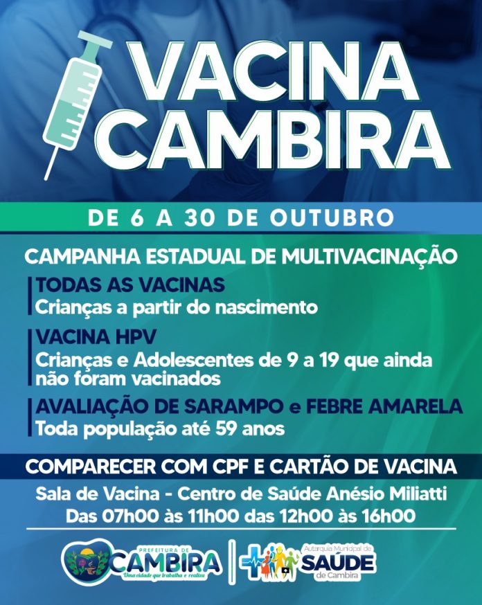 A Prefeitura de Cambira, por meio da Autarquia Municipal de Saúde, está participando da Campanha Estadual de Multivacinação, que segue até o dia 30 de outubro, com atendimentos realizados na Sala de Vacina do Centro de Saúde Anésio Miliatti.