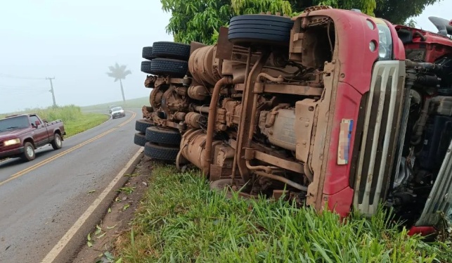 De acordo com informações apuradas no local, o motorista trafegava pela rodovia quando perdeu o controle do veículo ao passar pela curva. A carreta invadiu a pista contrária e acabou tombando às margens da estrada, parando em meio a uma plantação, próximo a uma árvore.