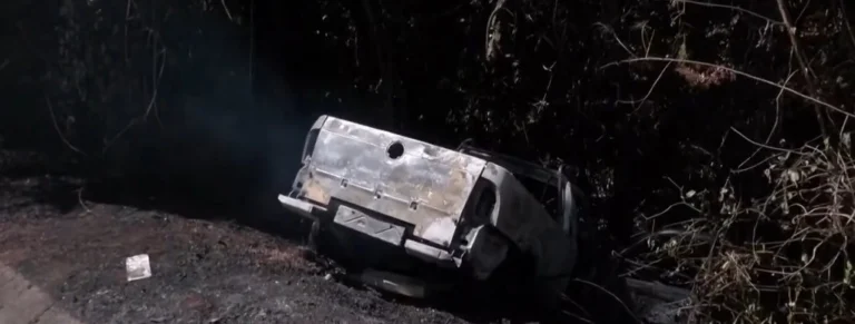 Uma picape ficou totalmente destruída após cair às margens da PR-317, entre os municípios de Maringá e Floresta, em uma região de mata, e pegar fogo no começo da tarde desta quinta-feira, 18. Segundo testemunhas, o motorista perdeu o controle do veículo, saiu da pista e bateu, momento em que as chamas começaram.