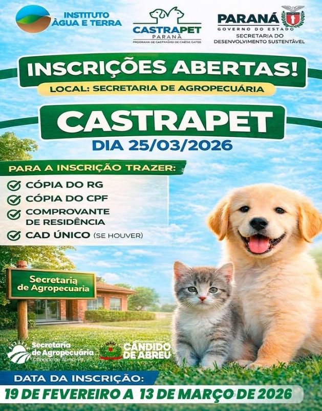 O município de Cândido de Abreu receberá, no dia 25 de março de 2026, o programa Castrapet Paraná, iniciativa do Governo do Estado coordenada pelo Instituto Água e Terra (IAT). A ação tem como objetivo promover o controle populacional de cães e gatos por meio da castração gratuita, contribuindo para a saúde animal, a prevenção de doenças e a redução do abandono.