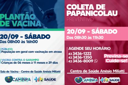 Cambira realiza Plantão de Vacina e Coleta de Papanicolau neste sábado (20)