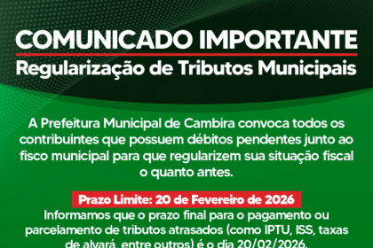 Prefeitura de Cambira convoca contribuintes para regularização de débitos até 20 de fevereiro