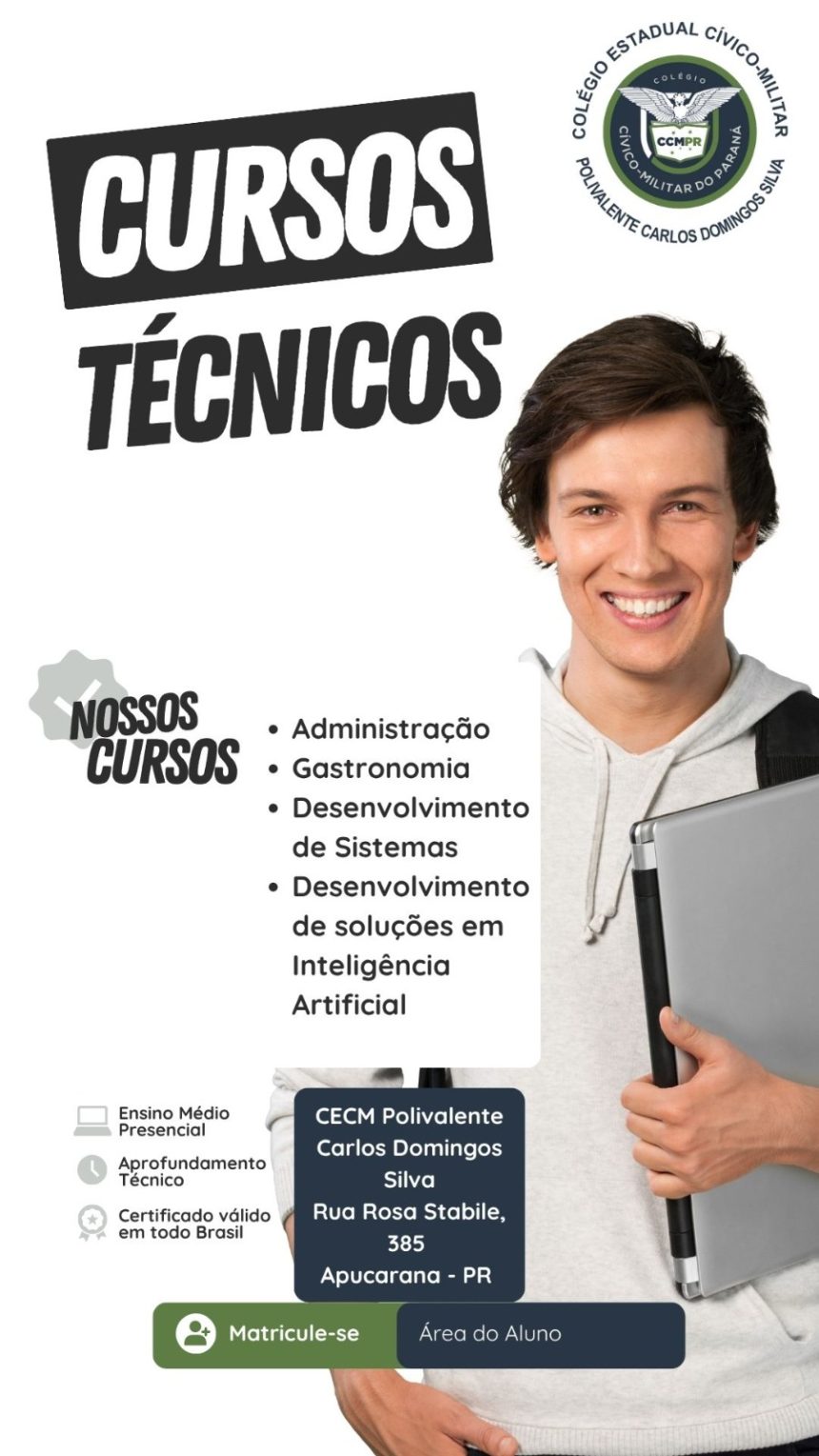 O Colégio Estadual Cívico-Militar Carlos Domingos Silva (Polivalente), de Apucarana, está com matrículas abertas até esta quarta-feira (15) para os cursos técnicos integrados ao ensino médio. As formações são gratuitas e voltadas para jovens que desejam concluir o ensino médio com qualificação profissional.