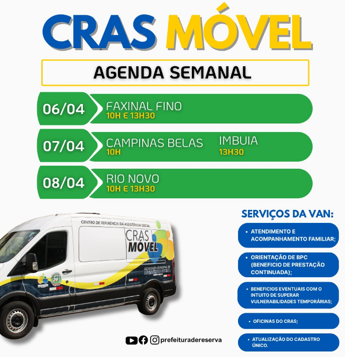 A Secretaria de Assistência Social, por meio do Centro de Referência de Assistência Social (CRAS) de Itambé, divulgou a agenda semanal de atendimentos do CRAS Móvel, que percorre comunidades do município levando serviços essenciais à população.