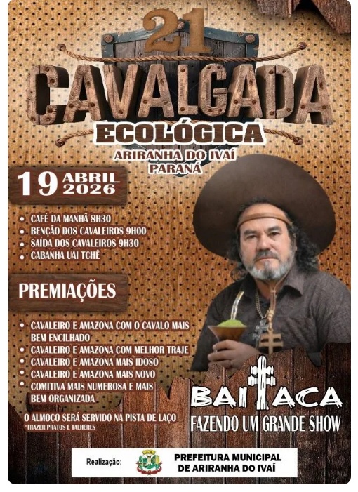 PRINCIPALVale do IvaíÉ AMANHà – Cavalgada Ecológica em Ariranha do Ivaí com show do Baitaca Publicada: 18 de abril de 2026 - 19:52 Reporter do Vale 1 Compartilhar Faxinal encaminha prestação de contas de 2025 ao Tribunal de Contas Prefeitura de Marilândia do Sul alerta sobre invasões na quadra de esportes da nova escola Motociclista de Cruzmaltina fica ferido após bater em caminhão parado na PR-453 Motorista morre em grave acidente em Apucarana Prefeitura de Borrazópolis convida a população para participarem de consulta pública sobre Parque Industrial TAGS:Ariranha do Ivaí Compartilhar esta notícia Facebook Whatsapp Whatsapp LinkedIn Copy Link Notícia anterior ENTREVISTA – Prefeito Pedro Taborda destaca ações desenvolvidas neste ano de 2026