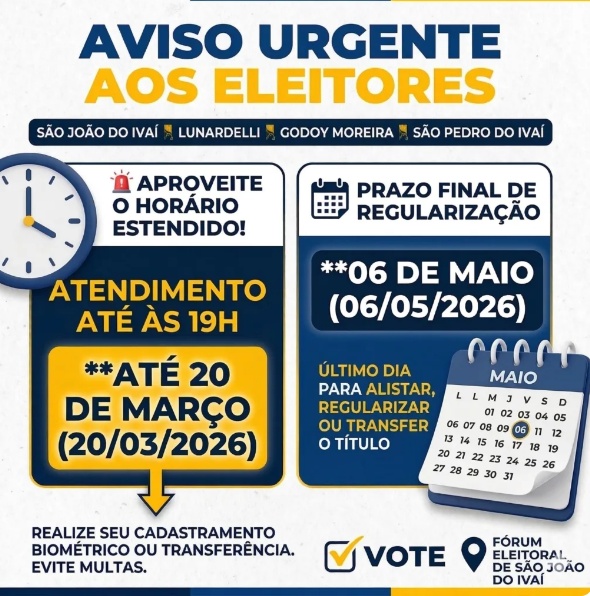 A 132ª Zona Eleitoral de São João do Ivaí divulgou um comunicado informando sobre o prazo final para operações relacionadas ao título de eleitor. Segundo o Cartório Eleitoral, o prazo para alistamento eleitoral (primeiro título), revisão e transferência de domicílio termina no dia 06 de maio.