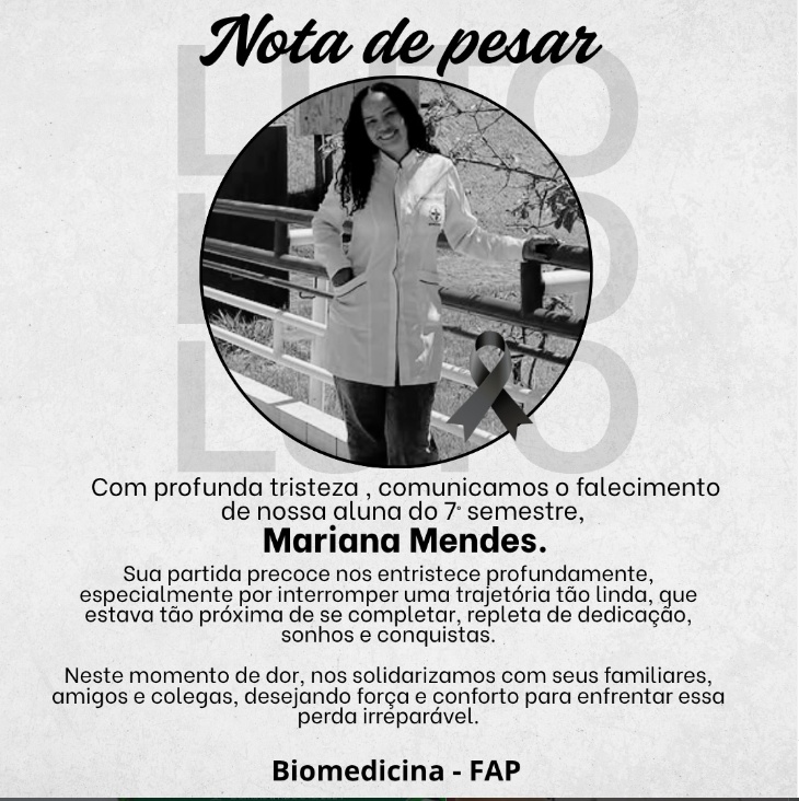 Uma jovem de 24 anos morreu após um acidente de trânsito registrado na manhã deste sábado (18), na BR-369, em Arapongas. A vítima foi identificada como Mariana Mendes, estudante do curso de biomedicina da Faculdade de Apucarana, que divulgou uma nota de pesar lamentando a morte.