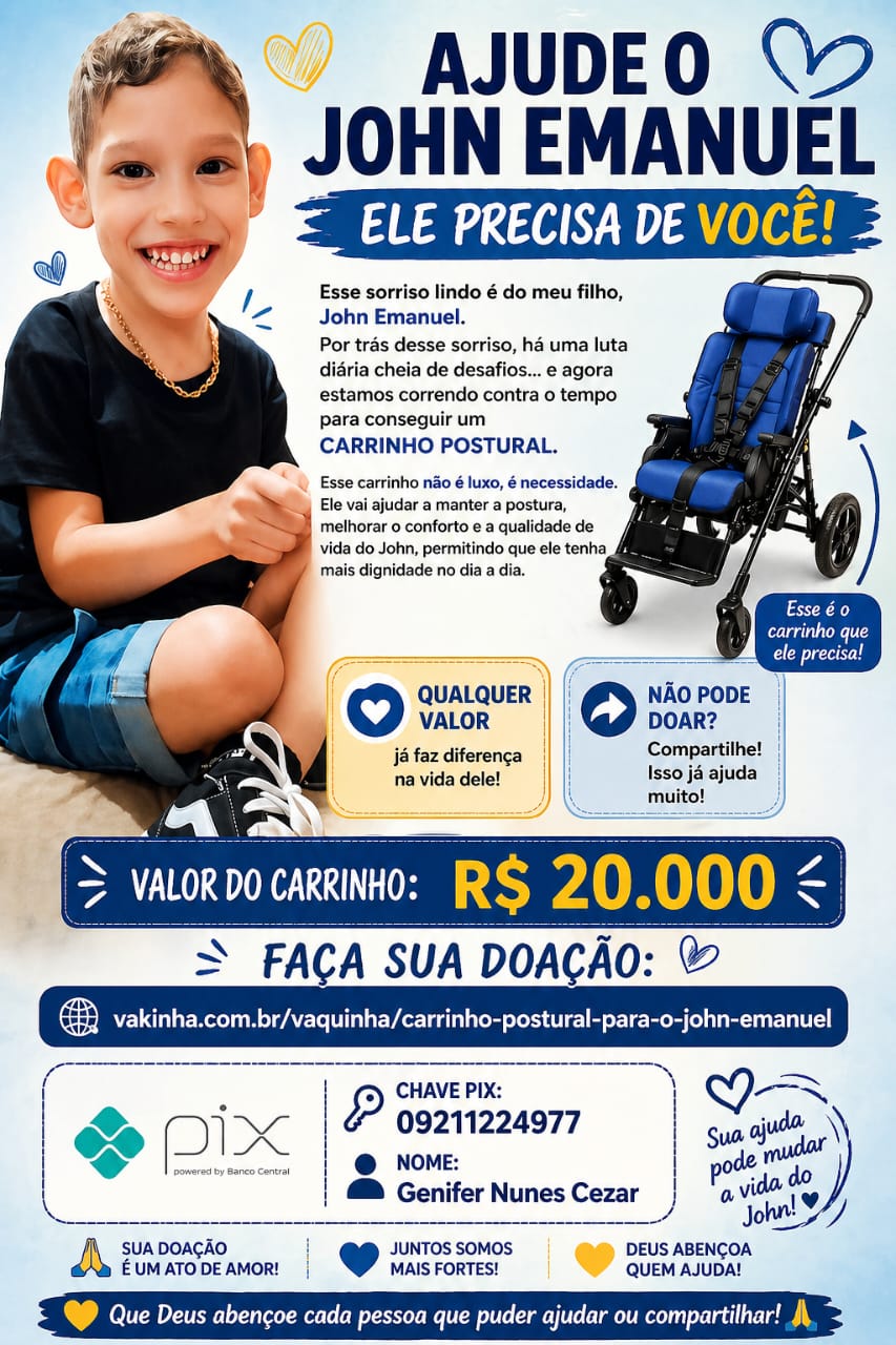 Para isso, a família busca adquirir um carrinho postural modelo Kimba, equipamento essencial que auxilia na posição correta do corpo, contribuindo diretamente para o bem-estar e a dignidade da criança. No entanto, o alto custo — cerca de R$ 20 mil — torna inviável a compra sem ajuda.