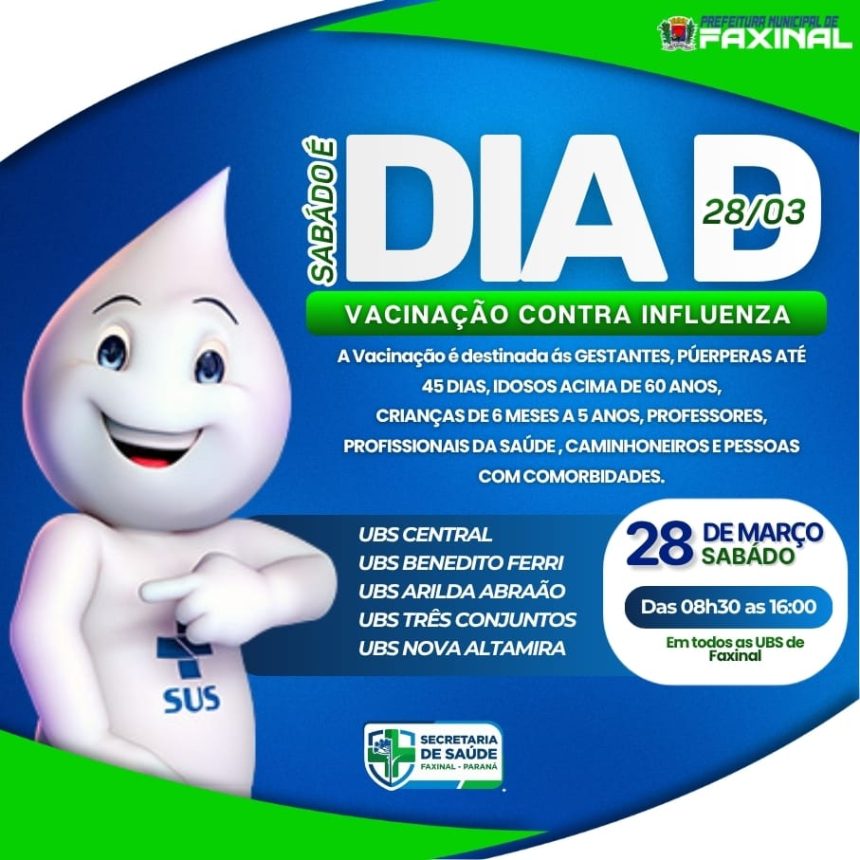 A Prefeitura de Faxinal, por meio da Secretaria Municipal de Saúde, promove no próximo sábado, dia 28 de março, o Dia D de vacinação contra a Influenza. A ação acontecerá em todas as Unidades Básicas de Saúde (UBSs) do município, com o objetivo de ampliar a cobertura vacinal e proteger a população contra as complicações da gripe.