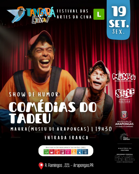 Em seguida, o esquete “Comédias do Tadeu”, um show de humor leve e descontraído para arrancar boas risadas do público. Ambas as obras foram viabilizadas pela Lei Paulo Gustavo.
