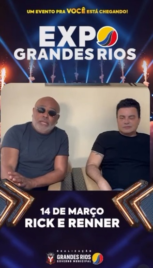 A Prefeitura de Grandes Rios anunciou uma grande atração para comemorar o aniversário do município. A consagrada dupla sertaneja Rick & Renner estará na cidade no dia 14 de março para um show especial que promete emocionar o público.
