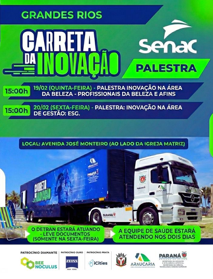 A Carreta da Inovação chega aos municípios de Serranópolis do Iguaçu e Grandes Rios, oferecendo oficinas, cursos e diversas atividades voltadas à ciência, tecnologia, inovação e capacitação profissional. As unidades itinerantes permanecem nas cidades até sábado (21), com programação das 9h às 12h e das 14h às 18h. Na quarta-feira, as atividades terão início às 13h.