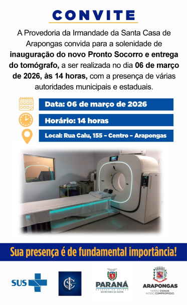O Hospital Santa Casa de Arapongas vai inaugurar, na próxima sexta-feira (06), às 14h, as instalações do novo pronto-socorro e oficializar a entrega de um tomógrafo. A solenidade terá a presença de autoridades locais e estaduais.