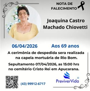 Com o impacto, a passageira do veículo atingido, de 69 anos, não resistiu aos ferimentos e morreu no local. A vítima foi identificada como Joaquina Castro Machado Chiovetti.