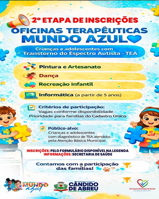 A Secretaria Municipal de Saúde de Cândido de Abreu informa que estão abertas até o dia 21/04, as inscrições para a 2ª etapa das Oficinas Terapêuticas Mundo Azul, destinadas às crianças e adolescentes com Transtorno do Espectro Autista (TEA) acompanhados pela Atenção Básica Municipal.