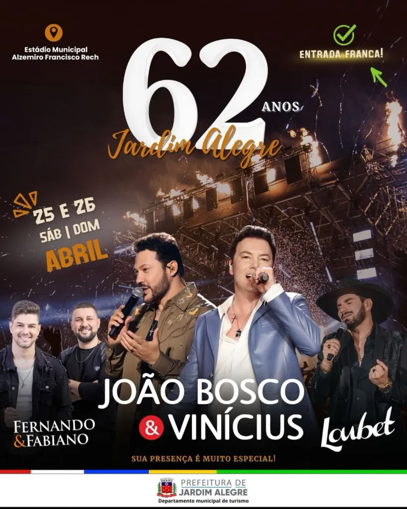 A administração municipal convida toda a população a participar desse momento especial e comemorar juntos os 62 anos de história de Jardim Alegre.