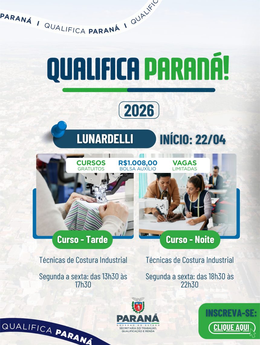 A Prefeitura Municipal de Lunardelli, por meio do programa Qualifica Paraná 2026, está com inscrições abertas para o curso gratuito de Técnicas de Costura Industrial. A formação, que visa capacitar profissionais para a indústria têxtil, oferece uma bolsa-auxílio de R$ 1.008,00 para os alunos selecionados. As aulas têm início confirmado para o dia 22 de abril de 2026, o curso está disponível em dois turnos: vespertino (das 13h30 às 17h30) e noturno (das 18h30 às 22h30),