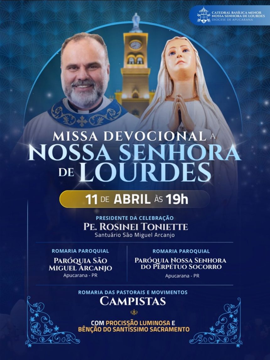 A Catedral Basílica Menor Nossa Senhora de Lourdes, em Apucarana, convida fiéis e a comunidade para a Missa Devocional em honra a Nossa Senhora de Lourdes, que será realizada no próximo dia 11 de abril (sábado), às 19h.