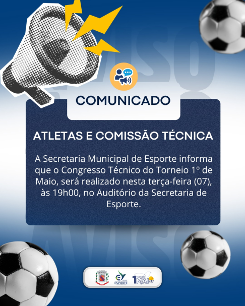 A Prefeitura de Arapongas, por meio da Secretaria Municipal de Esporte, comunica que o Congresso Técnico do Torneio 1º de Maio, anteriormente agendado para o Paço Municipal, foi transferido para o Auditório da pasta (antigo SESI). O evento será nesta terça-feira (07), às 19h00, ocasião em que será feito o sorteio que vai definir os grupos e confrontos da primeira fase da competição, além do alinhamento do regulamento.