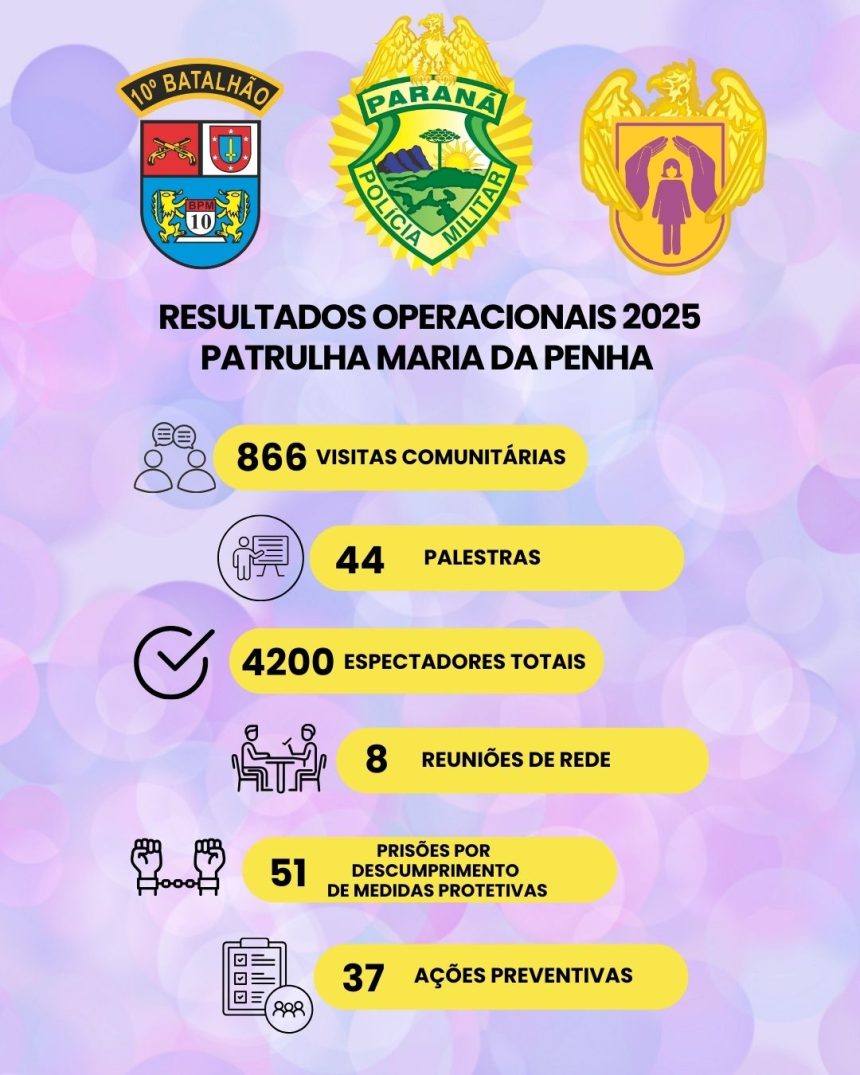A Patrulha Maria da Penha do 10º Batalhão da Polícia Militar apresentou, em 2025, resultados expressivos no enfrentamento à violência doméstica e familiar contra a mulher, consolidando-se como uma das principais frentes preventivas e repressivas da segurança pública na região.