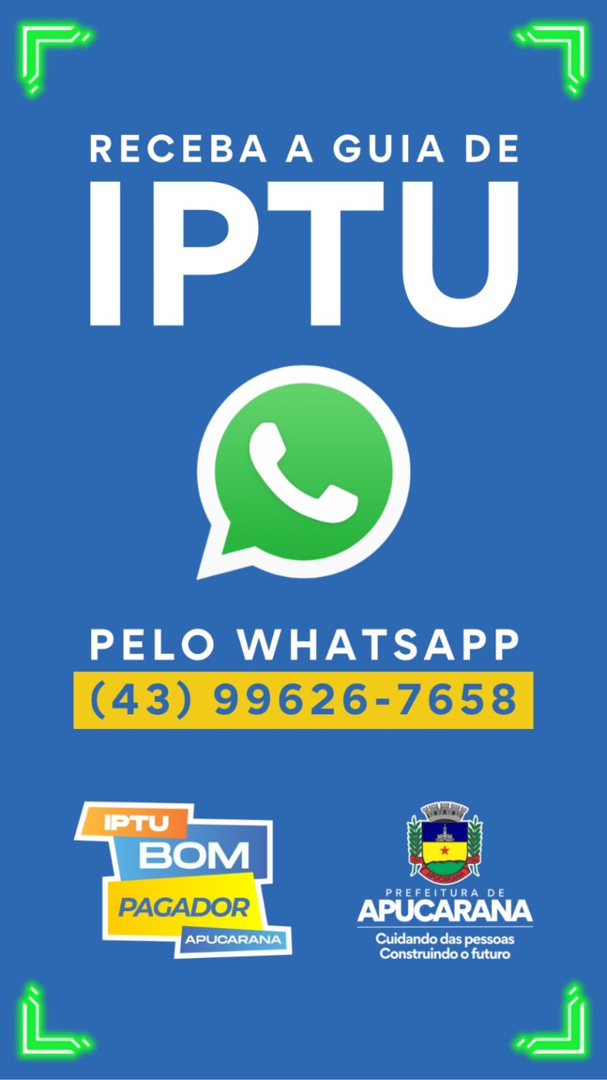 A Prefeitura de Apucarana passou a oferecer mais uma facilidade para os contribuintes acessarem a guia do Imposto Predial e Territorial Urbano (IPTU). Agora, o documento pode ser solicitado e enviado diretamente pelo WhatsApp, permitindo que o cidadão receba a guia no celular para realizar o pagamento de forma rápida e prática.