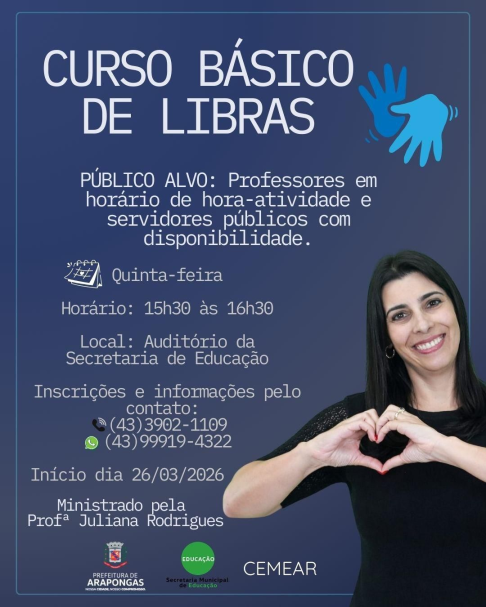 A Prefeitura de Arapongas, por meio da Secretaria Municipal de Educação, convida professores e servidores públicos para participarem do Curso Básico de Língua Brasileira de Sinais (LIBRAS). As inscrições podem ser feitas pelo link: https://docs.google.com/forms/d/e/1FAIpQLSfb0C50FwZC22mkSL4oqn86rt6uUJBOi8PbJe8BcODpompX-g/viewform?usp=publish-editor.