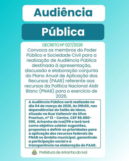 A Prefeitura de Ariranha do Ivaí convida toda a população, representantes do Poder Público e da Sociedade Civil para participarem da Audiência Pública que irá discutir e construir de forma conjunta o Plano Anual de Aplicação dos Recursos (PAAR), referente à Política Nacional Aldir Blanc (PNAB) para o exercício de 2026.