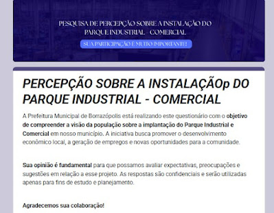 Segundo a Rafaela Jorge, que presta serviços para a prefeitura, é o Cristiano Stapait, Secretário de Agricultura, Meio Ambiente e Turismo, os moradores podem participar respondendo ao formulário pelo link: Clique aqui para responder. A gestão municipal reforça que a participação popular é fundamental para a construção de um futuro sustentável e próspero para Borrazópolis.