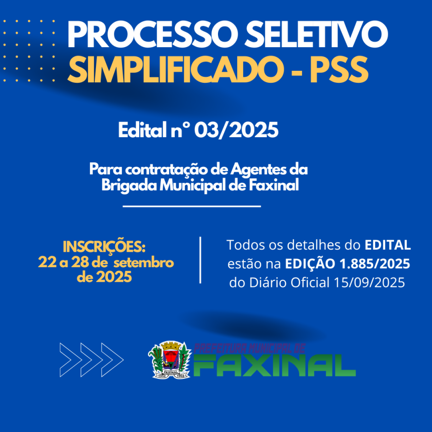 A Prefeitura de Faxinal, publicou na segunda-feira, 15, Edital nº 03/2025 para a contratação de Agentes da Brigada Municipal, por prazo determinado, para atender à necessidade temporária e excepcional de interesse público do Município de Faxinal, nos termos da Lei Municipal nº 2.431/2025. As inscrições, que são gratuitas, estarão abertas de 22 a 28 de setembro e podem ser realizadas pelo link Inscrição: https://faxinal.pr.gov.br/inscricao_formulario/4