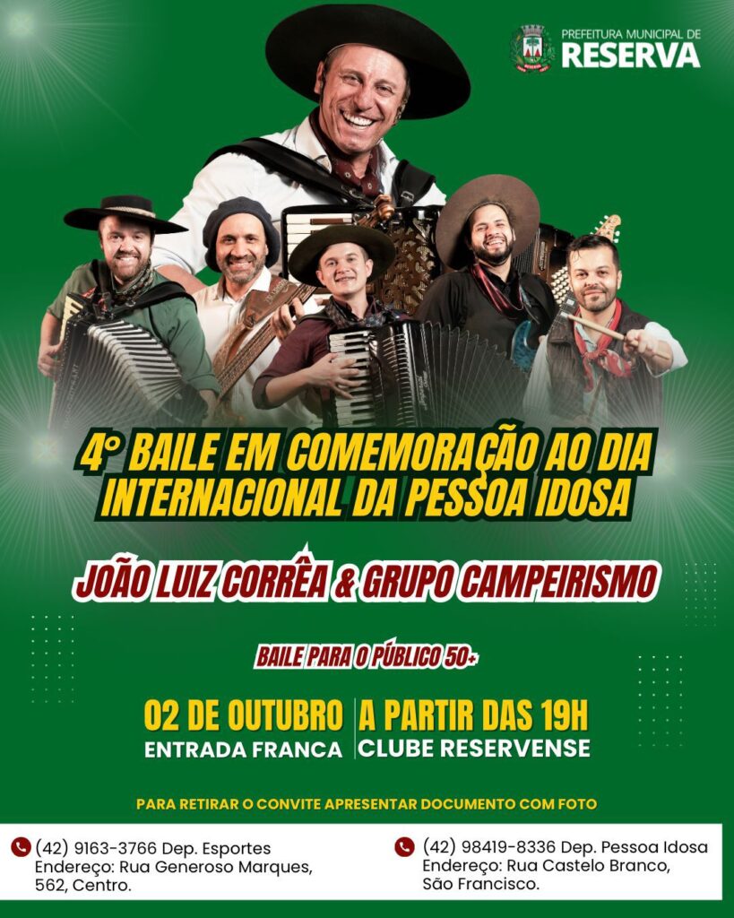 A Prefeitura, por meio da Secretaria de Assistência Social e do Departamento da Mulher, Família, Pessoa Idosa e Pessoa com Deficiência realiza, no dia 2 de outubro, o 4º Baile em Comemoração ao Dia Internacional da Pessoa Idosa. O evento será no Clube Reservense, às 19h, voltado ao público com 50 anos ou mais, terá entrada gratuita. Os ingressos começam a ser distribuídos nesta quarta-feira (10).