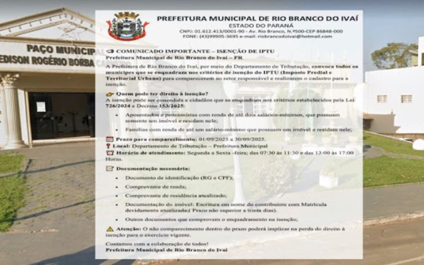 A Prefeitura de Rio Branco do Ivaí, sob a gestão do prefeito Pedro Taborda, divulgou um comunicado oficial convocando os moradores que se enquadram nos critérios de isenção do Imposto Predial e Territorial Urbano (IPTU) para realizarem o cadastro junto ao Departamento de Tributação.