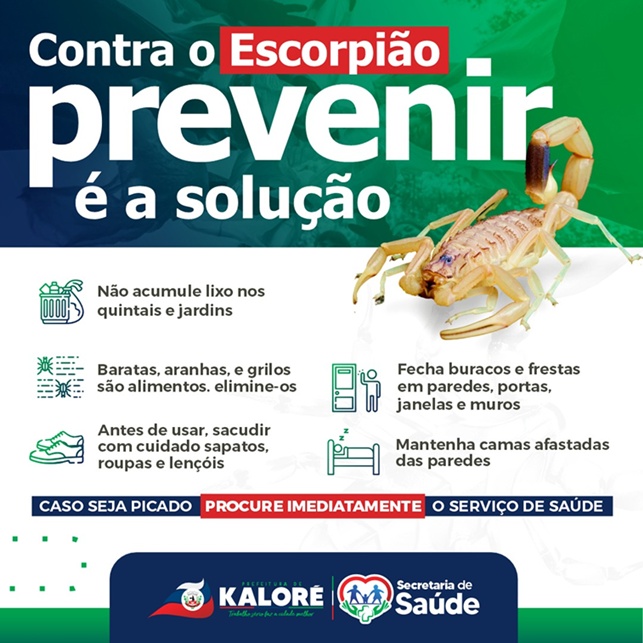 A Prefeitura de Kaloré, por meio da Secretaria Municipal de Saúde, iniciou uma campanha de orientação à população sobre os cuidados necessários para evitar acidentes com escorpiões. O objetivo é alertar a comunidade sobre a importância da prevenção, uma vez que a presença desses animais peçonhentos pode representar riscos à saúde.