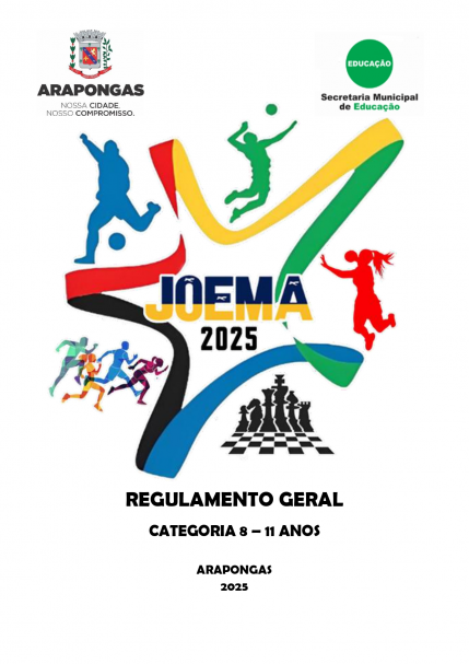 A Prefeitura do Município de Arapongas, por meio da Secretaria Municipal de Educação, anuncia que estão abertas as inscrições para a edição 2025 dos Jogos Escolares do Município de Arapongas – JOEMA, que vão ocorrer de 05 a 14 de novembro de 2025. A abertura está marcada para o dia 04 de novembro, no Ginásio de Esportes Luiz Augusto Zin, onde acontecerá o primeiro jogo de futsal do time campeão de 2024 com o time sorteado de 2025.